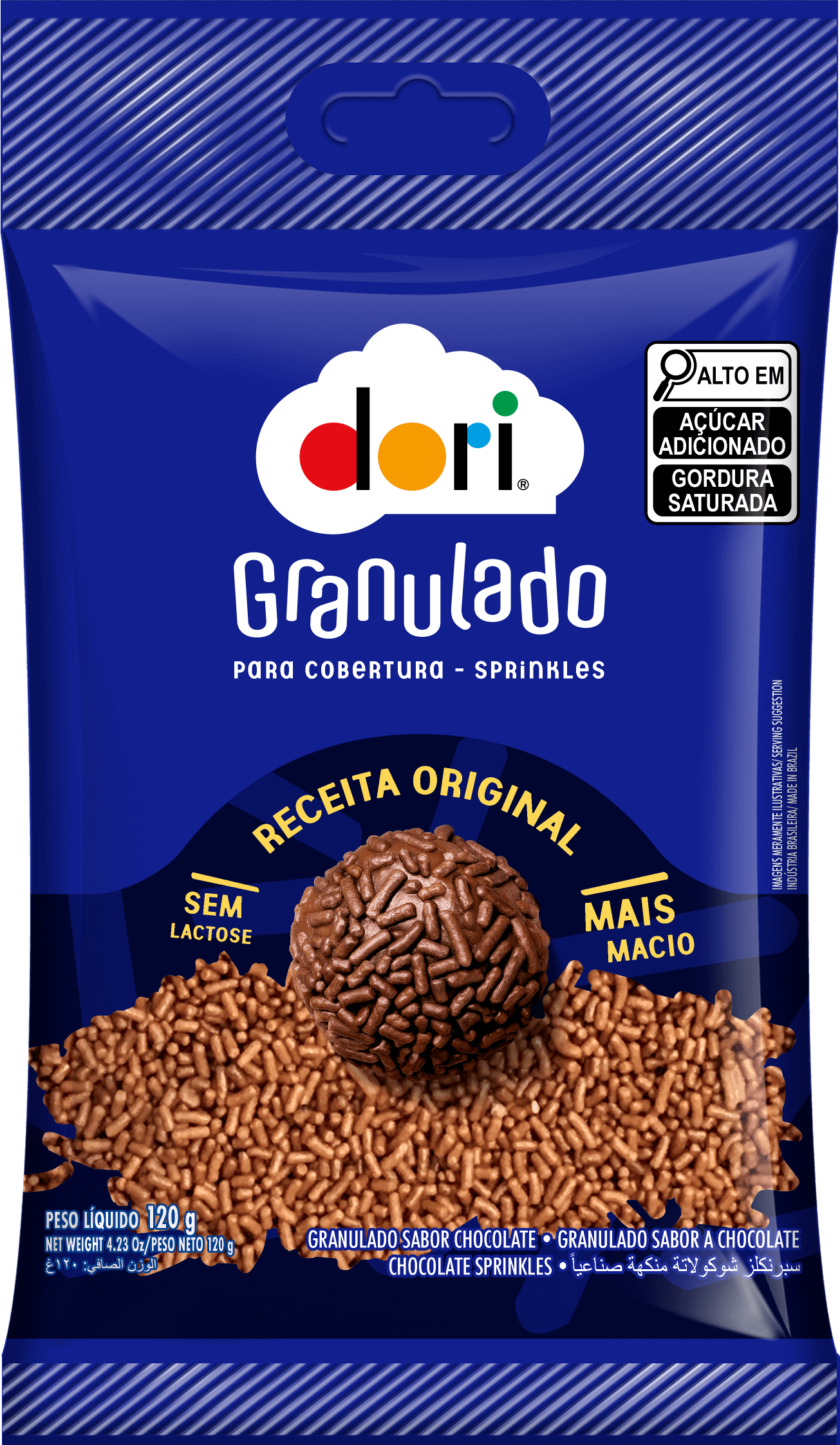 O Chocolate Granulado Dori 120g é um tipo de confeito utilizado principalmente para decorar e finalizar sobremesas. No Brasil, é tradicionalmente usado em receitas de brigadeiro, um doce popular feito com leite condensado, manteiga e chocolate em pó, que é enrolado em pequenas bolinhas e coberto com chocolate granulado. As características principais do Chocolate Granulado Dori 120g incluem seu sabor doce e achocolatado, além de sua textura crocante. Ele é composto por açúcar, cacau em pó, gordura vegetal e emulsificantes, que conferem a