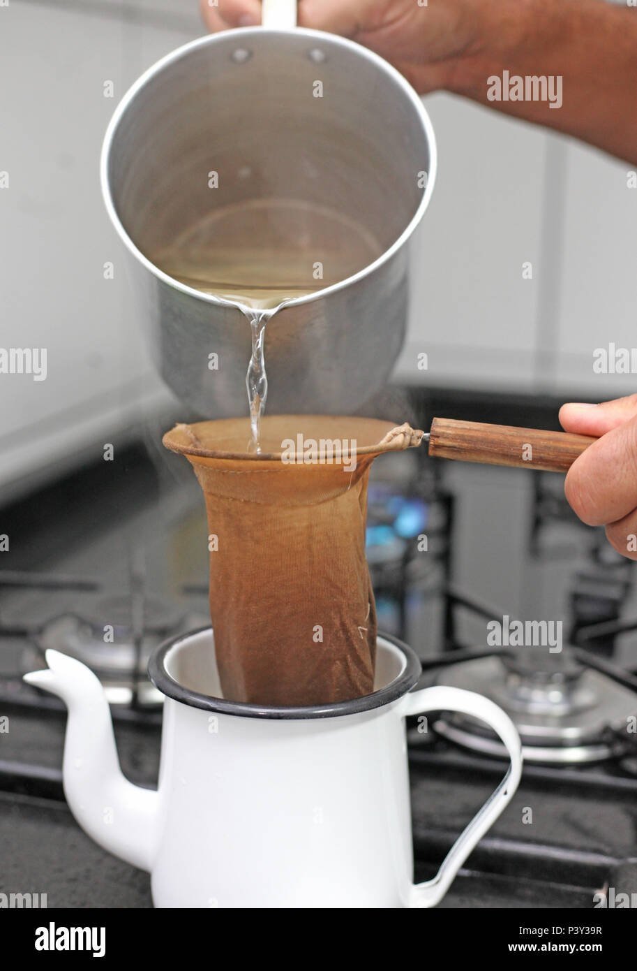 O Coador de Café de Pano é um utensílio tradicionalmente utilizado no Brasil para preparar café coado. Consiste em um suporte, geralmente de metal ou plástico, que sustenta um filtro feito de tecido, geralmente algodão. Este método de preparo é conhecido por proporcionar um café com sabor encorpado e aroma acentuado, preservando os óleos naturais do café que podem ser absorvidos por filtros de papel. O Coador de Café de Pano é reutilizável, sendo necessário laválo após cada uso e, ocasionalmente, fervêlo